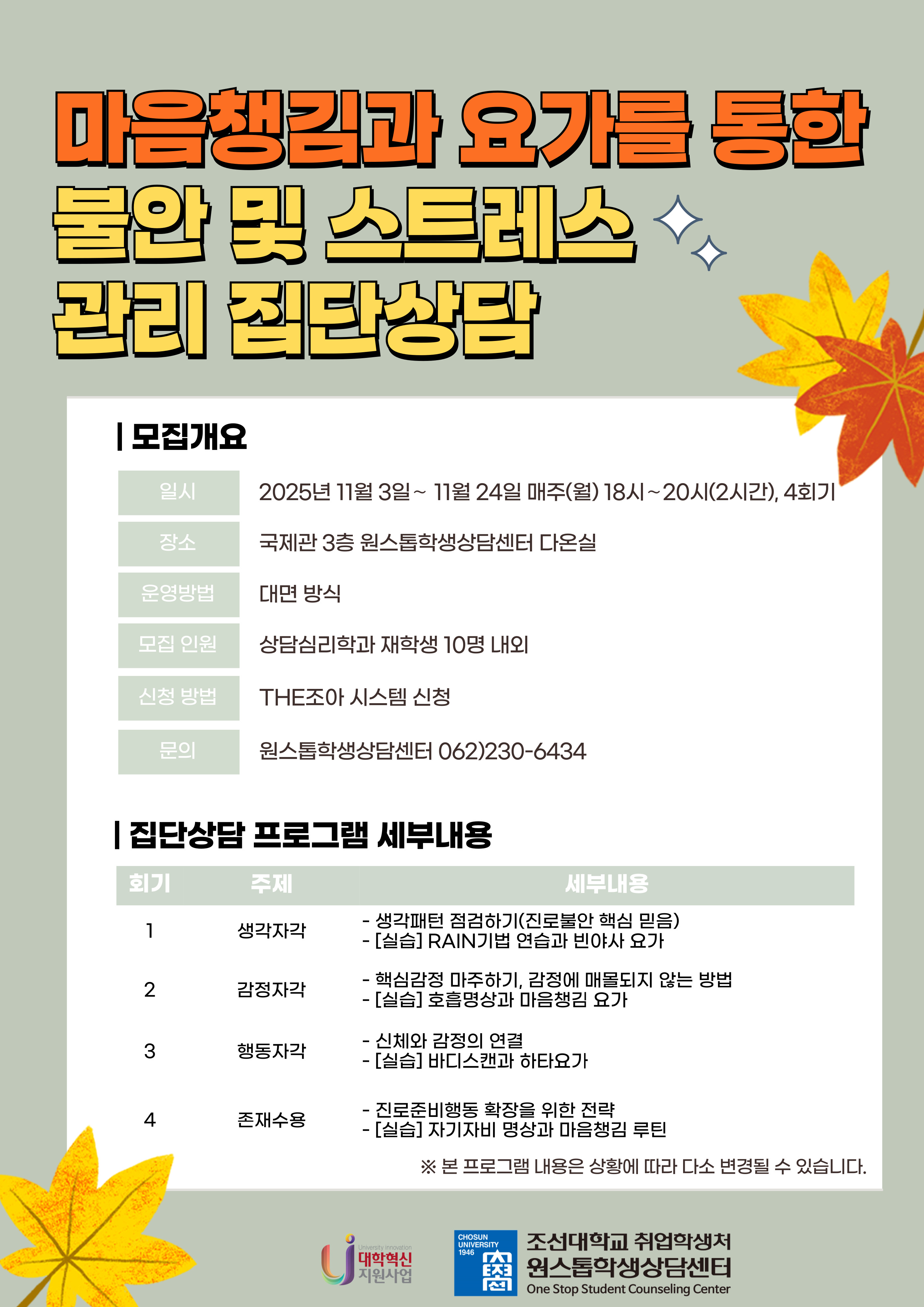 [원스톱학생상담센터] 마음챙김과 요가를 통한 불안 및 스트레스 관리 집단상담 참여자 모집